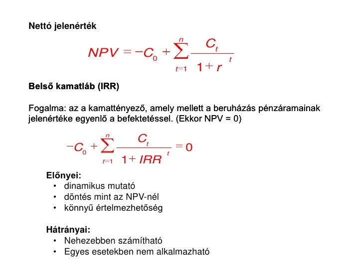 Irr Képlet. A vállalati emberek gyakran használják a tőkeprojektek összehasonlítására és eldöntésére. Kielégíti a minimum követelményt a beruházási terv, ha az irr = r , ebben az esetben a beruházás npv = 0.
